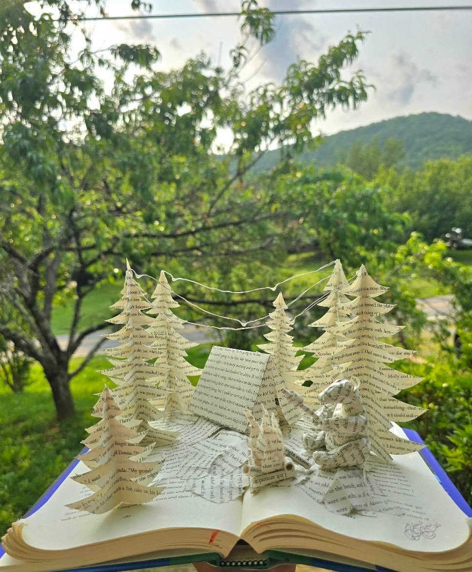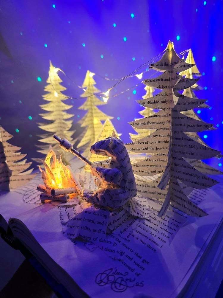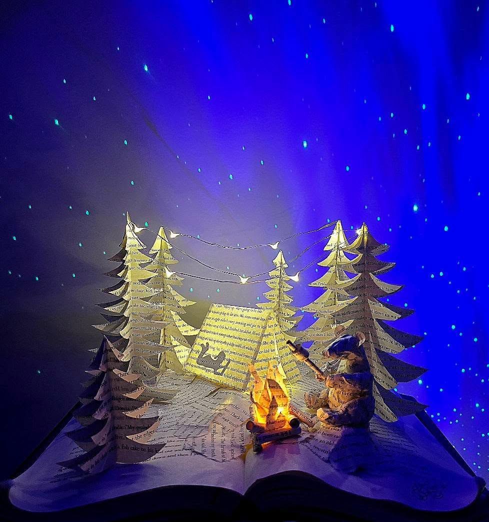 This class is a beginner level class. All supplies will be provided, as will pizza, brownies & one N/A drink at Peri Social's bar. If a specific hardcover book is desired for your sculpture, please bring that with you. The LED fairy lights we use are USB compatible. You may wish to purchase a converter so that you can plug your book sculpture directly into the wall. they will also run on rechargeable lithium batteries & any USB outlets. In some of my photos, there is a blue backdrop light. I use starlight projectors for my displays, & they can be purchased on Amazon to add to your piece.